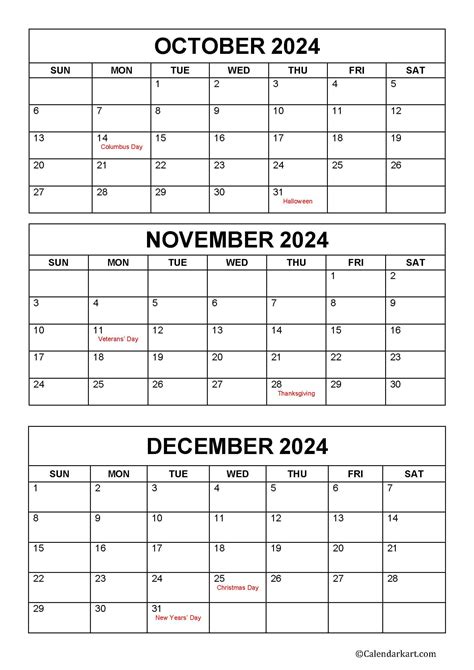 • Printable three months october, november and december 2024 calendar on single page, available to download for.