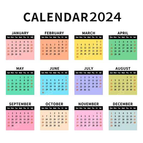 For those who prefer a yearly colorful calendar for 2024, this streamlined calendar uses minimal borders and four pastel colors.